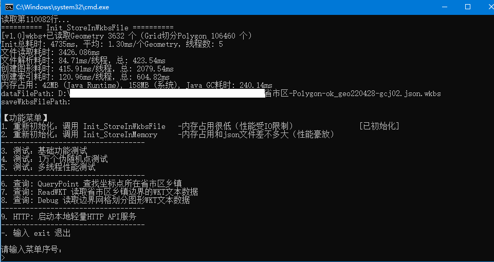 如果需要查询坐标对应的城市、查询城市或下级的边界数据,可下载 AreaCity-Query-Geometry Java开源程序进行高性能的查询,内存占用低(1秒可查1万个以上坐标对应的城市信息)。
