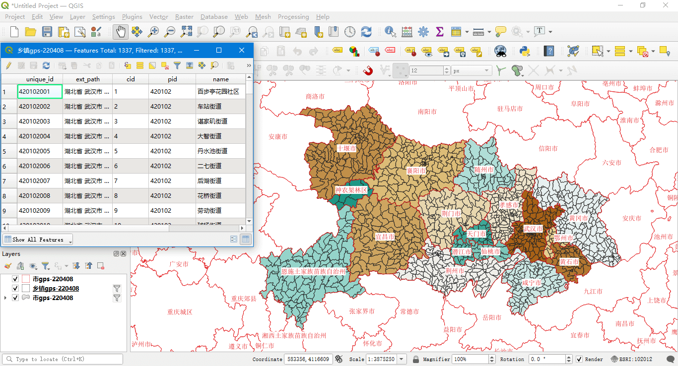 乡镇边界-湖北省(QGIS Asia_Lambert_Conformal_Conic投影):