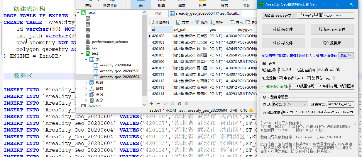 将 ok_data_level*.csv省市区镇行政区划 转成 SQL 文件、导入 数据库;可同时将坐标、边界范围附加到同一表中。