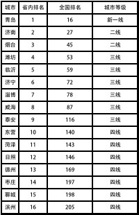 5月23日,《第一财经》旗下《新一线城市研究所》推出2019年城市分级排名报告:《中国城市商业魅力排行榜》,该报告覆盖中国337个地级以上城市,从商业资源聚集度、城市枢纽型、城市人活跃度、生活方式多样性、未来可塑性等5大维度衡量中国城市综合实力,将城市等级分为一线、新一线、二线、三线、四线、五线等6个等级。报告显示,山东省内16个地级市中,没有一线城市和五线城市,青岛市成为省内唯一新一线城市,济南市、烟台市为二线城市,此外还有6个三线城市和7个四线城市。