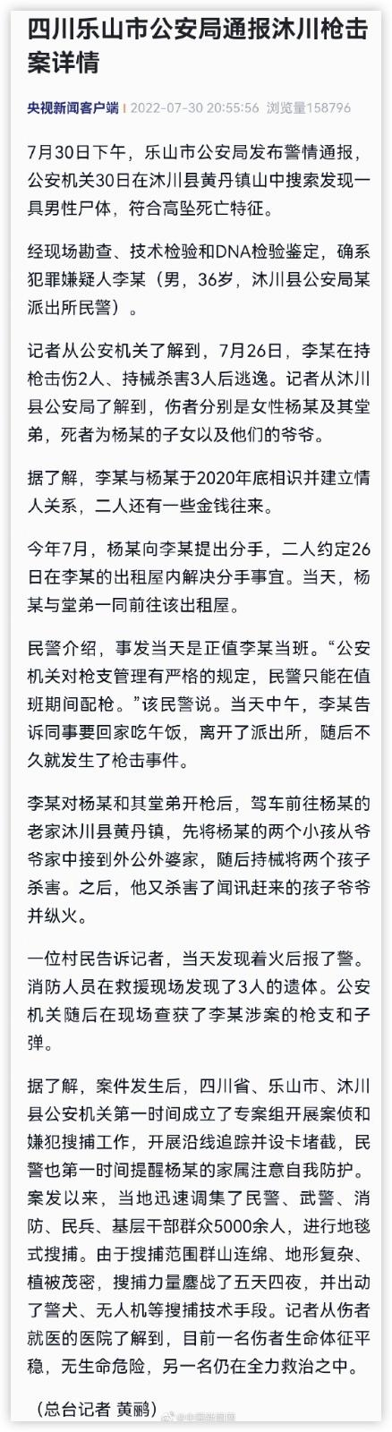 7.四川警方通报沐川枪击案详情:四川乐山警方30日发布通报称,在沐川县黄丹镇山中搜索发现一具男性尸体,符合高坠死亡特征。经鉴定,确系犯罪嫌疑人李某(男,36岁,沐川县公安局某派出所民警)。26日,李某在持枪击伤2人、持械杀害3人后逃逸。伤者分别是女性杨某及其堂弟,死者为杨某的子女以及他们的爷爷。据了解,李某与杨某于2020年底相识并建立情人关系,二人有金钱往来。(央视新闻)