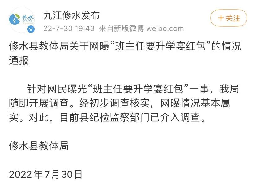 原标题:《班主任托班长要升学宴红包,班主任500、科任老师300?当地官方回应,纪检监察部门介入调查》