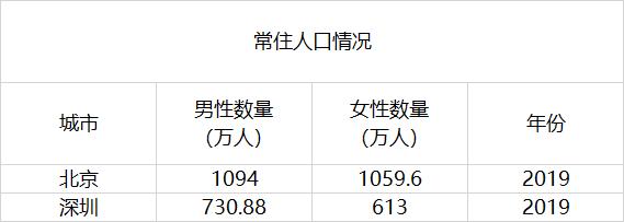 由于大部分城市都没有公布常住人口的性别情况,我们暂时只找到北京和深圳两座城市的数据: