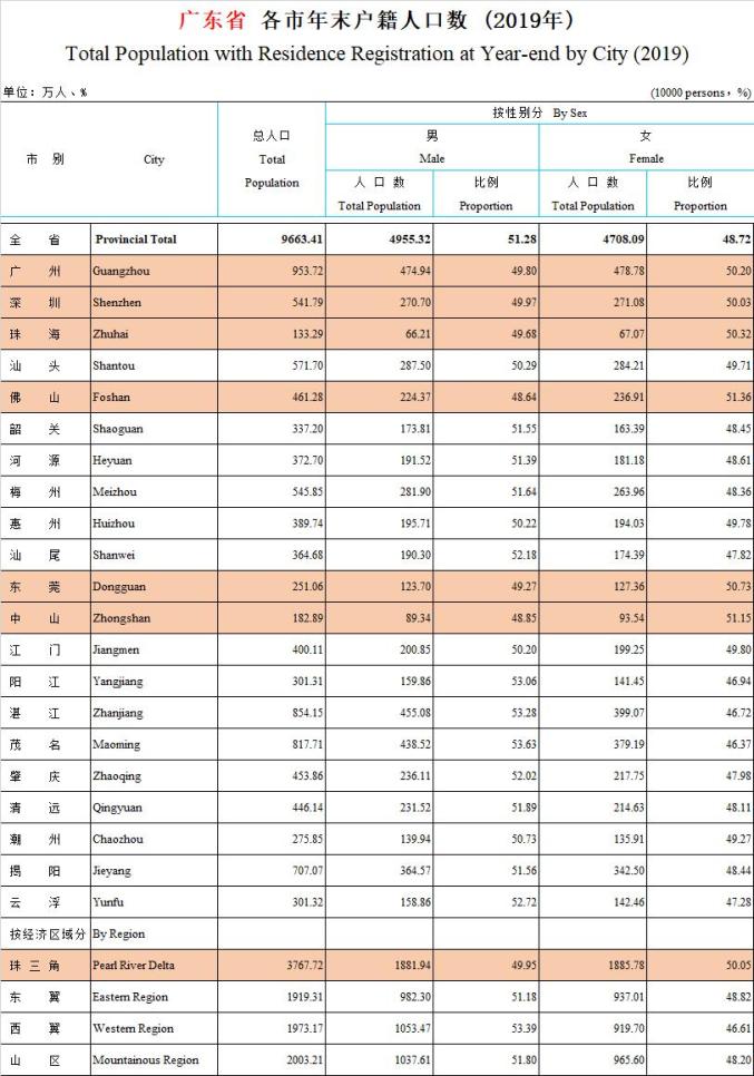 以下为2019年广东省各城市的户籍人口性别比例数据: