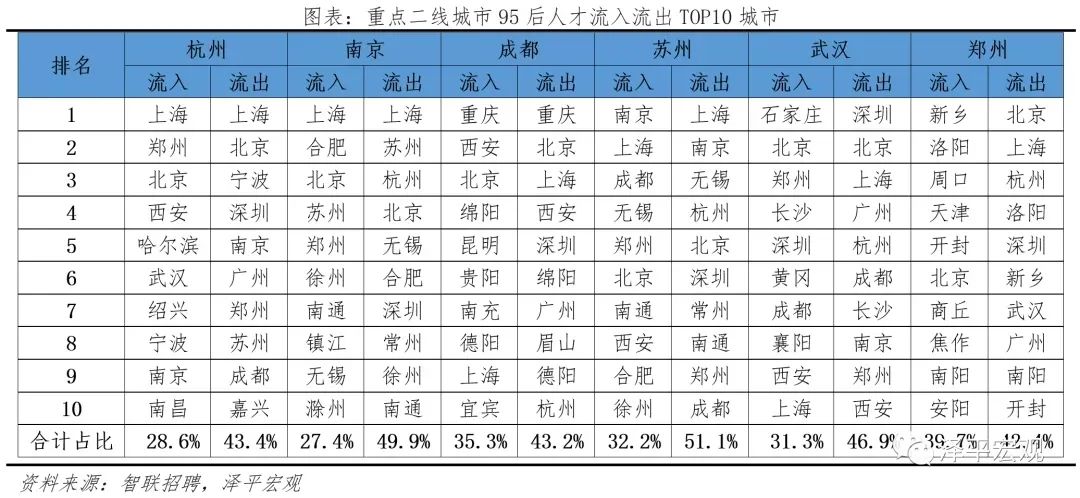 2)二线城市中,杭州、成都对95后人才集聚程度更高,人才净流入占比分别高出总体0.8、1个百分点;95后人才大部分为城市群内部流动,由于武汉地处主要经济带中心、九省通衢,其人才来源地丰富,前十大城市来自9个不同省级行政单位。从人才净流入占比看,前十强二线城市杭州、南京、成都、苏州、武汉、郑州的95后人才净流入占比分别为2.4%、1.3%、0.9%、1.2%、0.7%、0.2%,较总体分别高出0.8、0.4、1.0、0.4、0.5、0.7个百分点,杭州、成都对95后集聚程度更高。从来源和去向看,杭州流入流出城市前两名均为北京、上海,合计占比分别为7.8%、15.8%,杭州发展所需人才主要在一线城市中,杭州也具有从一线城市抢夺人才的能力;南京流入流出城市均有8个位于长三角地区,合计占比分别为21.5%、41.5%,南京和长三角的人才互动非常频繁,部分因为南京高校较多,长三角人才为求学向南京集聚,毕业后从南京回流至长三角其他城市;95后人才向成都流入和从成都流出的前十大城市合计占比分别为35.3%、43.6%,流出成都的城市更集中;苏州流入流出城市均有5个在长三角地区,占比分别为18.7%、36.79%,其中上海对苏州虹吸效应明显,从苏州流向上海95后人才占比为14.6%;武汉地处长江与京广铁路大动脉的十字交汇点,有“九省通衢”之称,95后人才来源地遍布各地,前十城市中来自9个不同的省级行政单位。流出武汉的城市更集中,其中流出前四大城市为深圳、北京、上海、广州,均为一线城市,合计占比27.5%;流入郑州城市有9城位于中原城市群,占比35.9%,流出郑州城市有6城位于中原城市群,其余4城为北上深广。