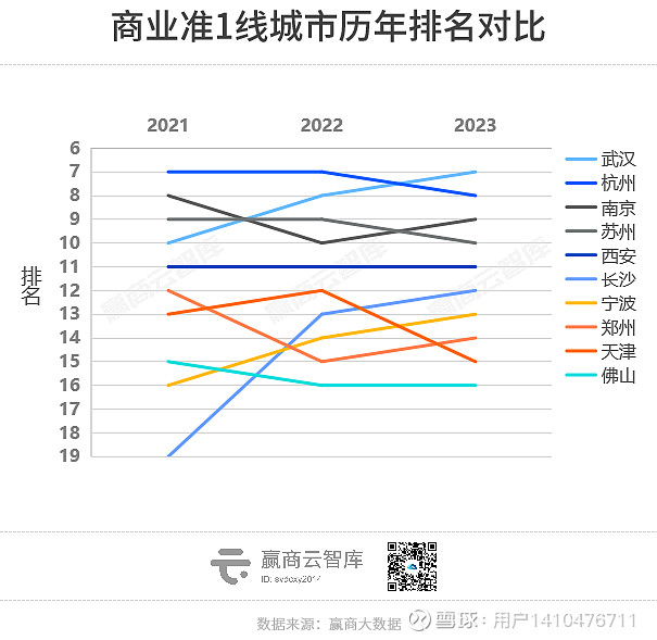 2023商业准1线城市为武汉、杭州、南京、苏州、西安、长沙、宁波、郑州、天津、佛山十城。