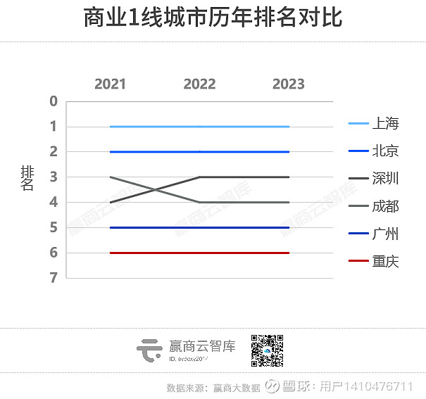 2023商业1线城市依旧为上海、北京、深圳、成都、广州、重庆6城。排名与2022年无异,深圳稳住TOP3,成都扼守TOP4。
