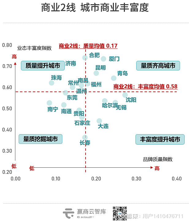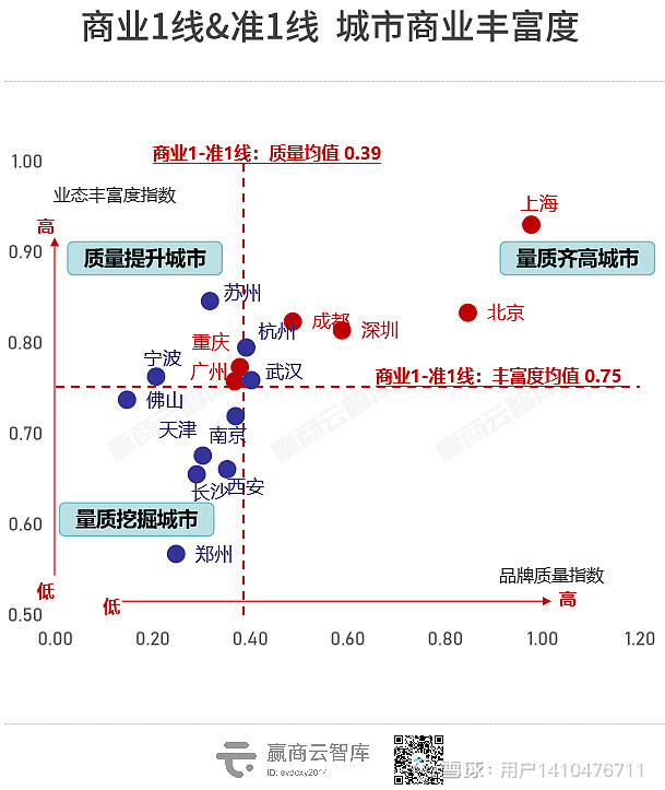 通过交叉分析,可划分为四个象限,分别对应四个城市类型。由于不同线级城市业态丰富度与品牌质量差异较大,通过同类城市(商业1线及准1线、商业2线城市)的比较,可更清晰判断城市商业丰富度水平。