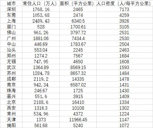 此次统计结果中,市域人口密度最高的10个城市分别是深圳、东莞、上海、厦门、佛山、广州、中山、汕头、郑州和无锡。其中前8个城市的人口密度超过了2000人/平方公里。