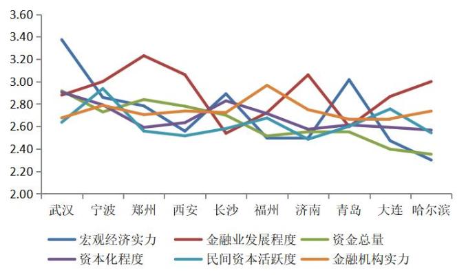 第三梯队的金融实力总得分均在3分以下,共有武汉、宁波、郑州、西安、长沙、福州、济南、青岛、大连、哈尔滨十个城市。其金融实力总得分的差距非常小,仅有0.2分,但由于资源禀赋和发展基础不同,优劣势也各异(图8)。