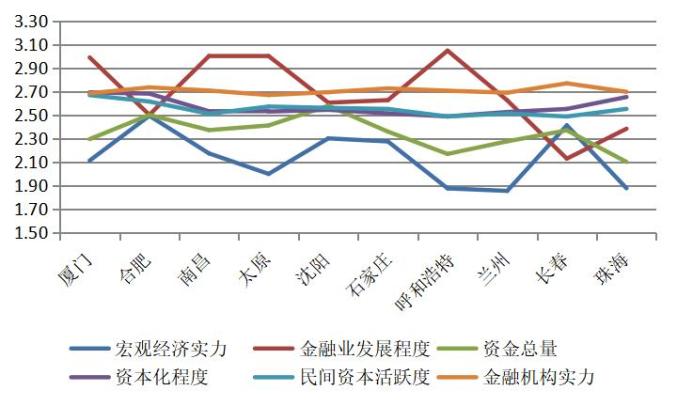 10个城市的宏观经济实力、金融业发展程度和资金总量折线较为曲折,显示其表现差异较大。从资金总量看,其走势基本与城市GDP一致,即沈阳和合肥的宏观经济实力强,资金总量也较高;珠海和兰州的宏观经济实力稍弱,资金总量的得分也较低。