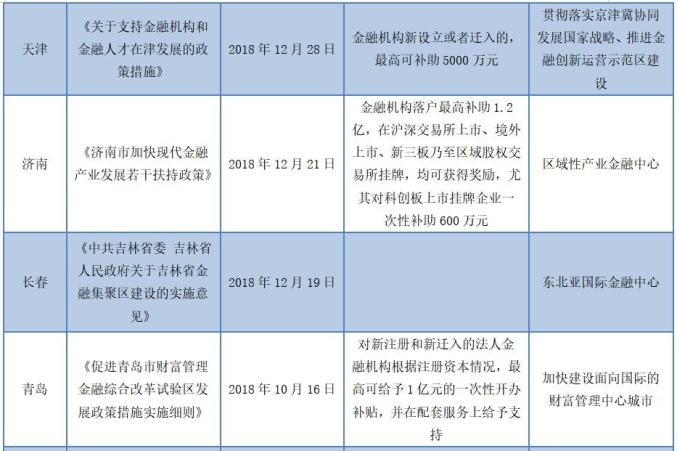 济南也不甘落后。就在青岛出台政策的2个月后,2018年12月21日,济南也发布了《济南市加快现代金融产业发展若干扶持政策》,提出加快建设产业金融中心,促进现代金融产业发展,并对新设立或新引进的法人金融机构,实缴注册资本50(含)亿元以上的,补助1.2亿元,扶持力度空前。这也是目前各城市在吸引金融机构落户时开出的最高奖励。此外,对企业上市挂牌、直接融资也有扶持政策,如对在科创板上市的企业一次性补贴600万元。