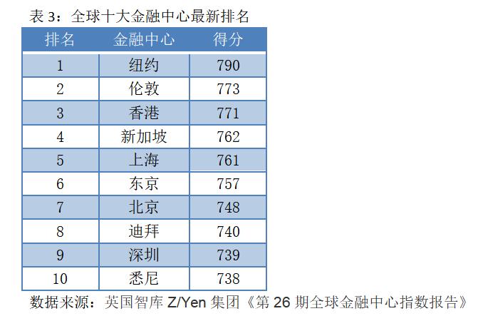 由英国智库Z/Yen集团与中国(深圳)综合开发研究院共同编制的第26期全球金融中心指数报告2019年9月19日在伦敦和深圳同时发布。全球十大金融中心最新排名依次为:纽约、伦敦、香港、新加坡、上海、东京、北京、迪拜、深圳和悉尼(表3)。上海进入前五,仅次于纽约、伦敦、香港和新加坡,与第四名的新加坡仅相差1分。深圳在本期榜单中排名也有较大跃升,较上期提升5位,排名全球第九,与排名第八的迪拜也仅相差1分,并与上海、北京同时跻身全球十大金融中心。随着科创板开板、“沪伦通”开启,上海金融改革开放的步伐正在稳步向前,超越新加坡乃至香港,或为时不远。