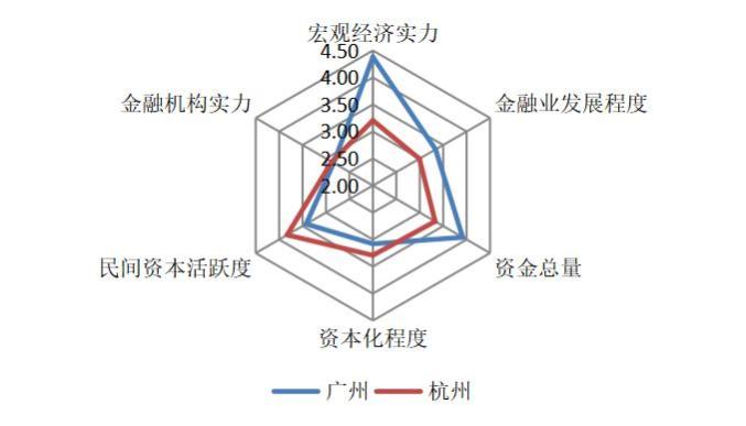 相比排名仅次于自己的杭州,广州目前在宏观经济实力、金融业发展程度和资金总量三个维度上大幅领先,但在资本化程度、民间资本活跃度和金融机构实力上落后(图4)。