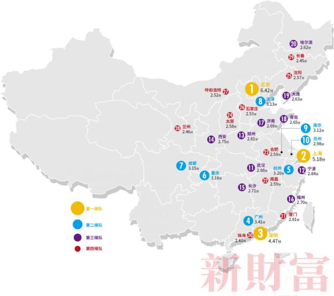 第一梯队,总得分≥4分,包括北京、上海、深圳3个城市;
