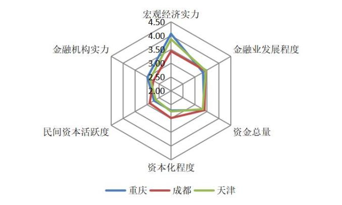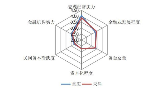 从金融实力对比图看,这两个城市在各维度上的得分差距不大,资金总量、资本化程度和民间资本活跃度的得分基本相同。重庆在宏观经济实力上更强一些,天津则在金融业发展程度上更胜一筹(图5)。