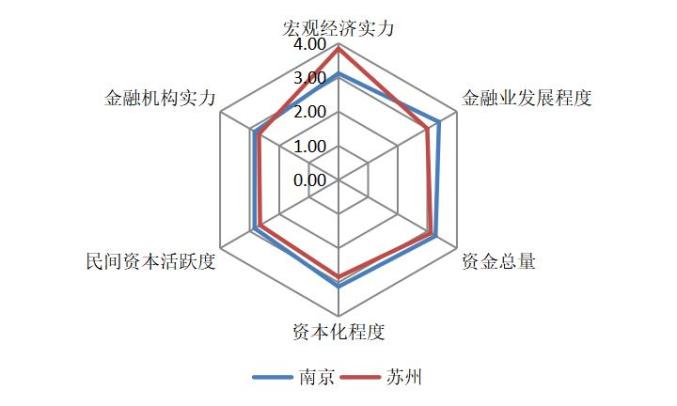 南京虽然GDP不如苏州,但是作为历史名城和大省会,综合优势明显。南京2018年度的金融业GDP为1473.32亿元,占GDP的比重为11.49%以上;2018年南京的人民币存款余额为3.37万亿元,超过苏州的2.86万亿元。在上市公司的实力上,截至2018年,南京有83家上市公司,总市值达9021.33亿元,强于苏州的64家及5145.48亿元的总市值。并且南京在2018年新增6家上市公司,苏州仅2家。在富人实力上,南京有10位富人上榜,财富总额达1175.4亿元,富人数量和财富总额均两倍于苏州。在金融机构的实力上,南京的券商和商业银行的数量和资产总额同样领先于苏州,不过两个城市均没有法人公募基金机构。