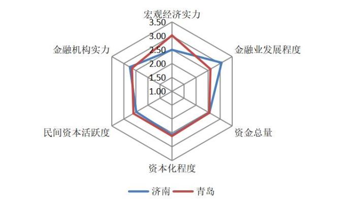 从金融实力对比图可看出,两个城市的资金总量、资本化程度、民间资本活跃度和金融机构实力基本相当,最大的差异在于,青岛的宏观经济实力领先,济南在金融业发展程度上更胜一筹。