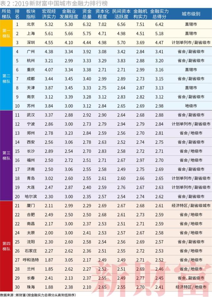 在包括30个城市的“新财富中国城市金融力Top30排行榜”上,排名前三的依次是北京、上海和深圳,这三地也是全国性的金融中心,实力无可争议(表2)。