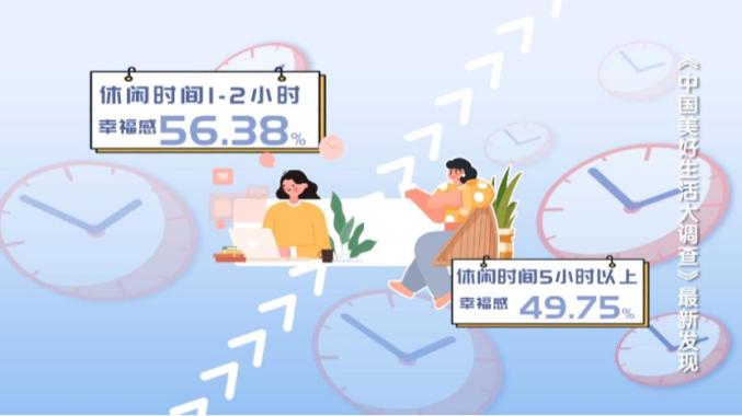 大调查发现,休闲时间1-2小时的人群,幸福感最高,达到56.38%。休闲时间5小时以上人群中,感到幸福的比例只有49.75%。