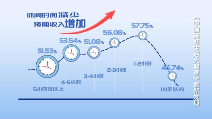 大调查发现,除了休闲时间在1小时以内的人群外,从整体来看,随着休闲时间的减少,预期收入会增加的比例在增加。充实的工作可能会让人们更有收入的安全感。