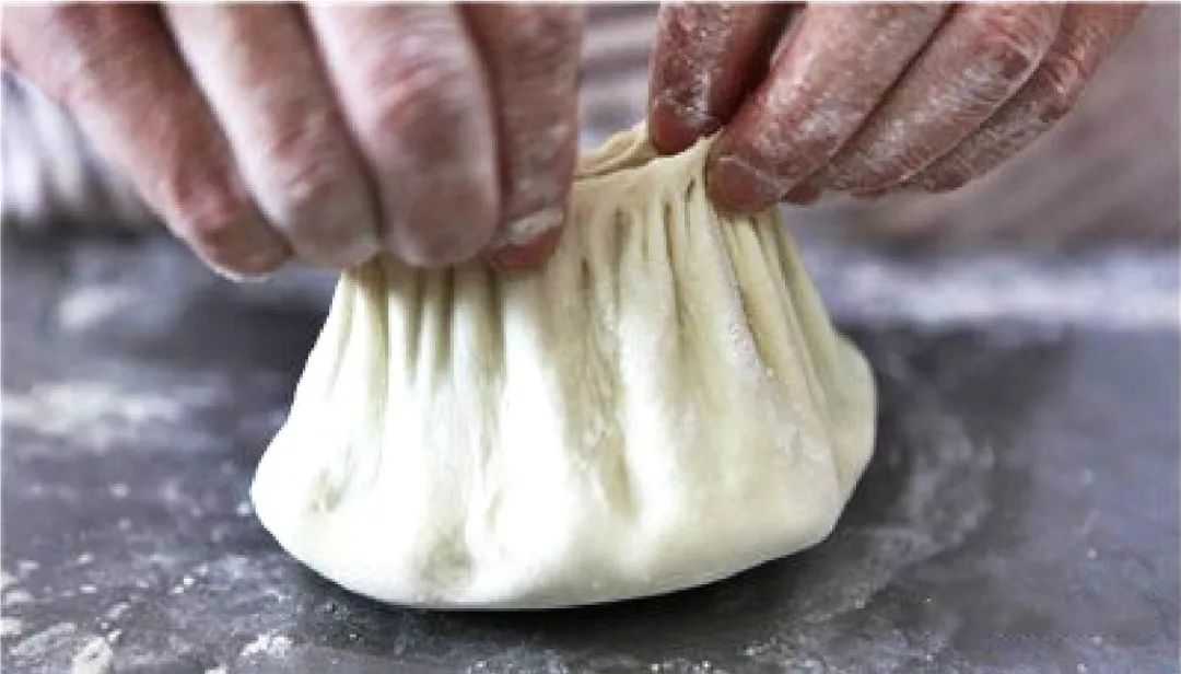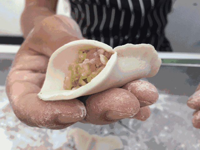 武义肉麦饼,家庭团圆之时会做。手工擀面皮,放上馅料,像包包子一样把皮叠起来,之后封口,把上面多余的那一团揪掉,让麦饼平整,又带着褶皱。
