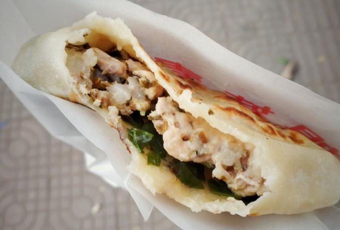 烤肉麦饼的锅大多采用浅而平的烤盘,这样烤熟的肉麦饼饼体饱满、皮黄带软,加上带有武义特色的酸菜肉馅,食之满口香脆。