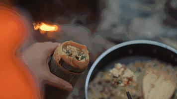 往一端凿空的竹筒里填料——湿米、香菇、猪肉、干菜之类,塞得差不多了,便用木塞封住凿口,将它放到火堆上烤。