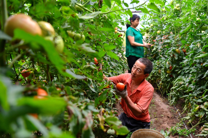 承包安太堡露天煤矿复垦区温室的李瑞平(前)、韩育珍夫妇在采摘西红柿(8月8日摄)。