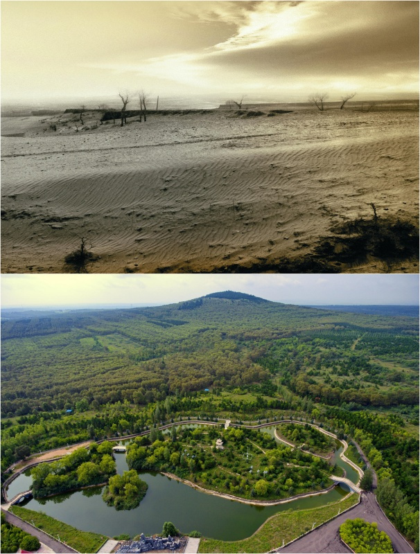 拼版照片:上图为治理前,朔州市右玉县的荒凉沙地(资料照片);下图为右玉县小南山森林公园(新华社记者曹阳8月7日摄)。