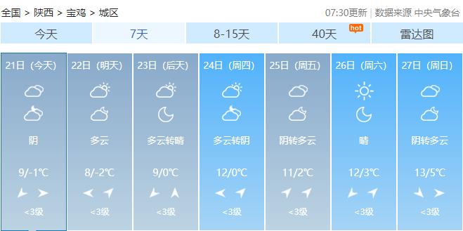 24日至27日气温回升明显,川塬区日最高温度达15℃左右,最低温度为0℃至4℃。南北山区最高温度为10℃至13℃,最低温度为-6℃至0℃。