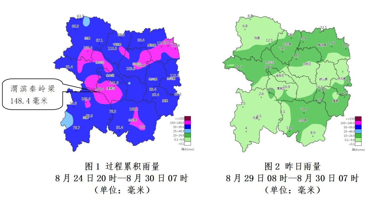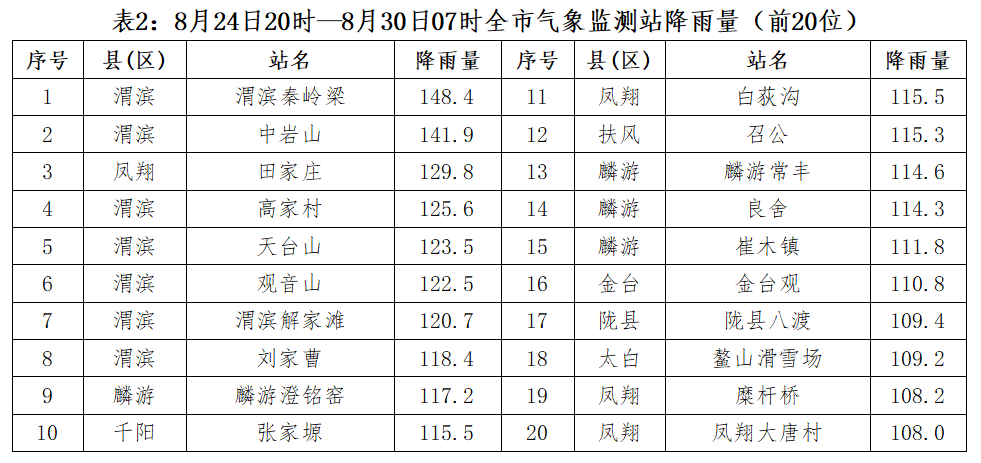 其中,8月29日8时至30日7时,全市共有181个气象监测站(100%)出现降雨,平均降雨量为10.0毫米,72站超过10毫米,1站超过25毫米,最大为太白县高龙28.0毫米;小时雨强最大为渭滨中岩山10.3毫米/小时。