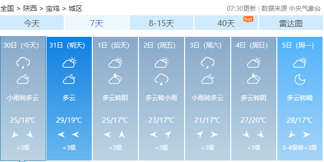 宝鸡新闻网讯 据宝鸡市气象局消息,截止到8月30日7时,本轮降雨结束。8月24日夜间至30日,全市大部分县区出现暴雨,最大降雨量为渭滨秦岭梁148.4毫米。预计未来三天(8月30日-9月1日)我市天气以多云为主,气温逐步回升。