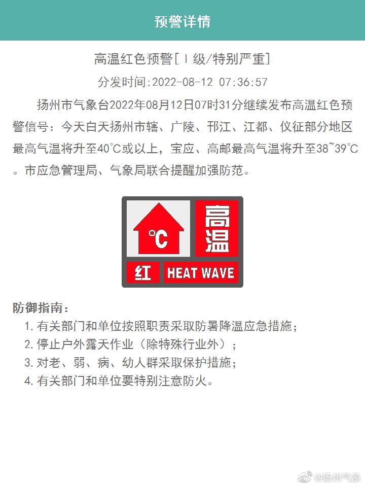 未来几天,继续是高温霸屏,昨天,仪征率先跨进40℃高温圈,并一举站上全省高温琅琊榜,与宜兴并列第二名。真是热得红红火火恍恍惚惚!刚刚,扬州市气象台继续发布高温红色预警信号:今天白天扬州市辖、广陵、邗江、江都、仪征部分地区最高气温将升至40℃或以上,宝应、高邮最高气温将升至38~39℃。好消息是,一股来自海上的东北风可能会吹来缓解一下高温,大伙期待吧!