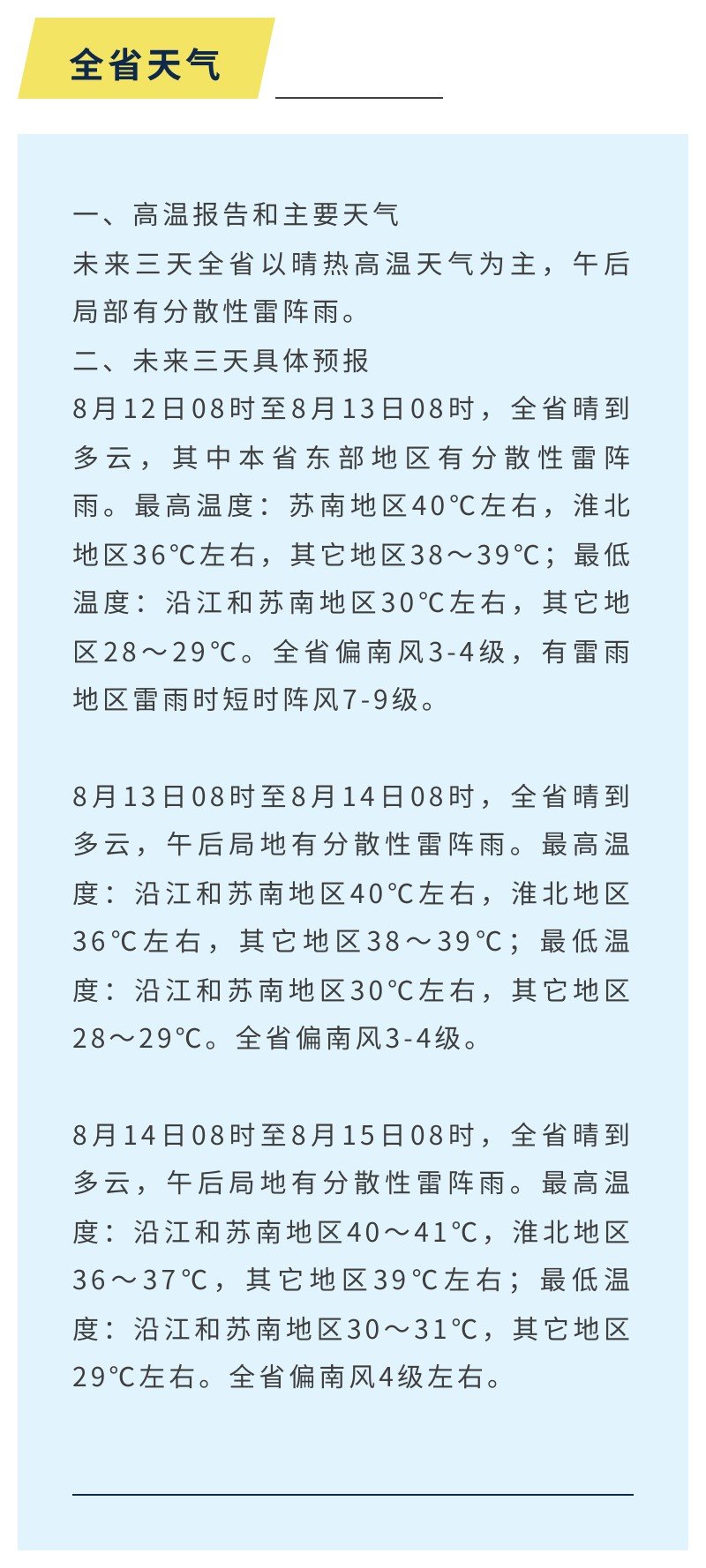 8月12日08时至8月13日08时,全省晴到多云,其中本省东部地区有分散性雷阵雨。最高温度:苏南地区40℃左右,淮北地区36℃左右,其他地区38~39℃;最低温度:沿江和苏南地区30℃左右,其他地区28~29℃。全省偏南风3-4级,有雷雨地区雷雨时短时阵风7-9级。