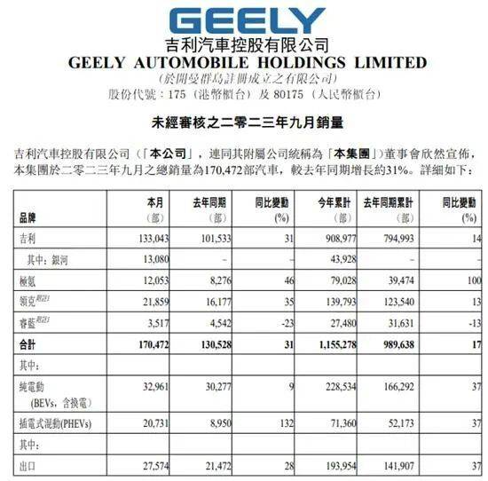 我们从吉利集团9月份的新能源业务增长情况可以看出一些新的迹象。比如9月共销售新能源汽车53692辆,环比增长约14%,同比增长约37%。其中,纯电动车型销售32961辆,同比增长9%,插电式混动车型销售20731辆,同比增长132%。