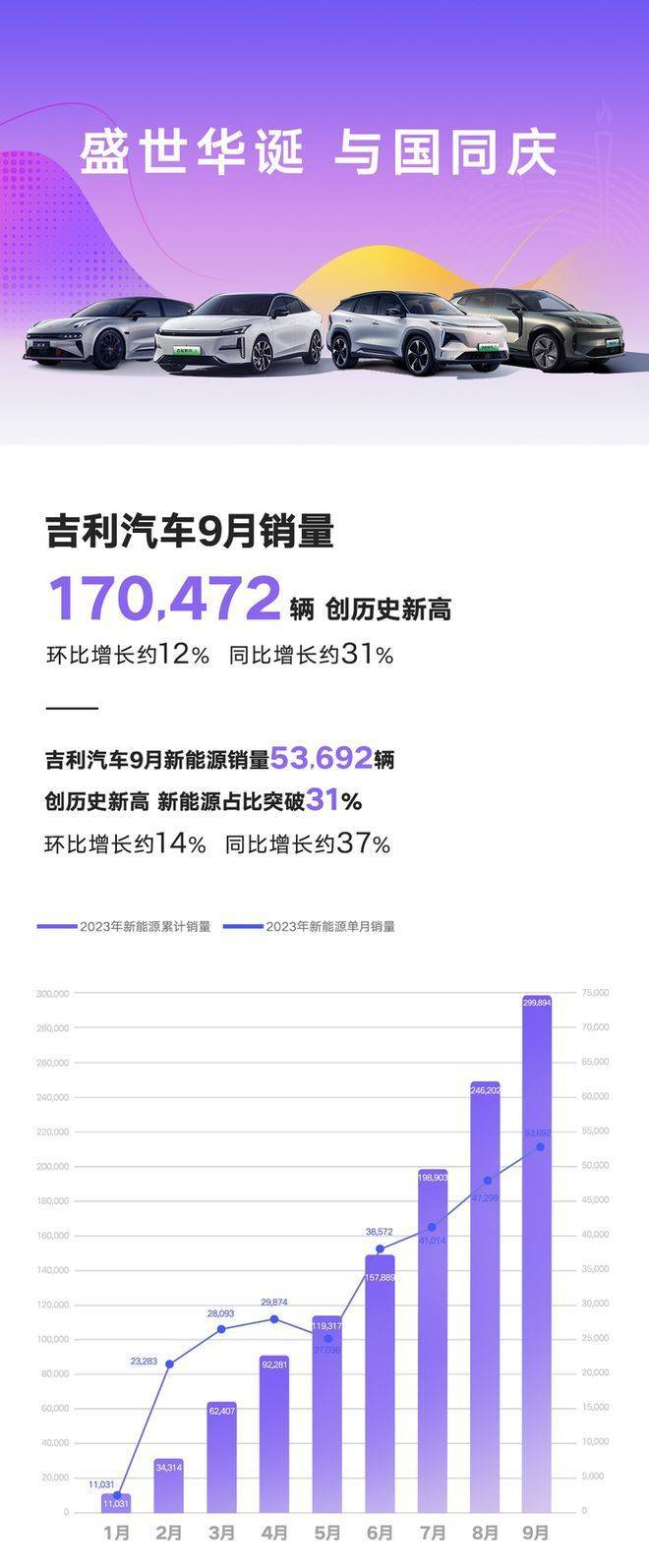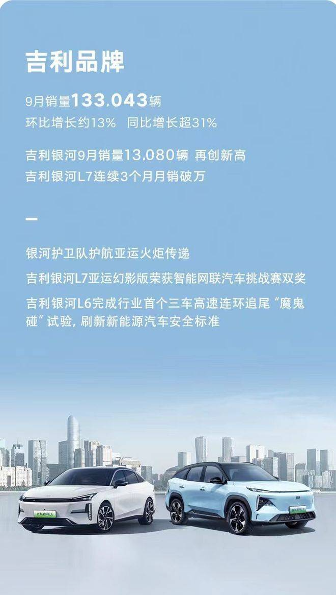 今年9月公布的销量数据显示,吉利汽车9月共卖出17.0472万辆,其中,吉利银河销量1.308万辆再创新高,银河 L7更是连续3个月销量破万。