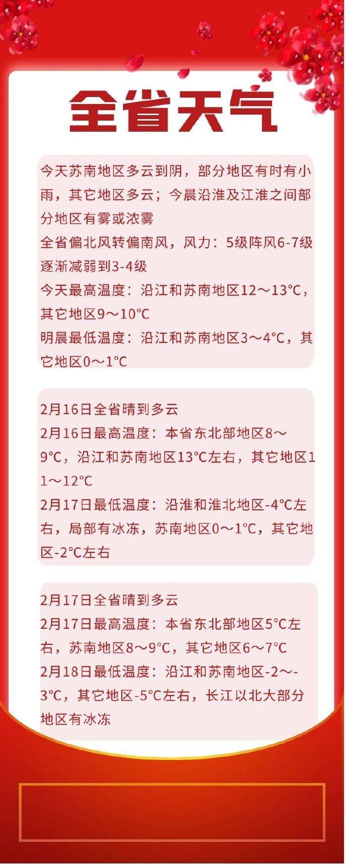 今天苏南地区多云到阴,部分地区有时有小雨,其它地区多云;今晨沿淮及江淮之间部分地区有雾或浓雾,全省偏北风转偏南风,风力:5级阵风6-7级逐渐减弱到3-4级,今天最高温度:沿江和苏南地区12~13℃,其它地区9~10℃,明晨最低温度:沿江和苏南地区3~4℃,其它地区0~1℃。