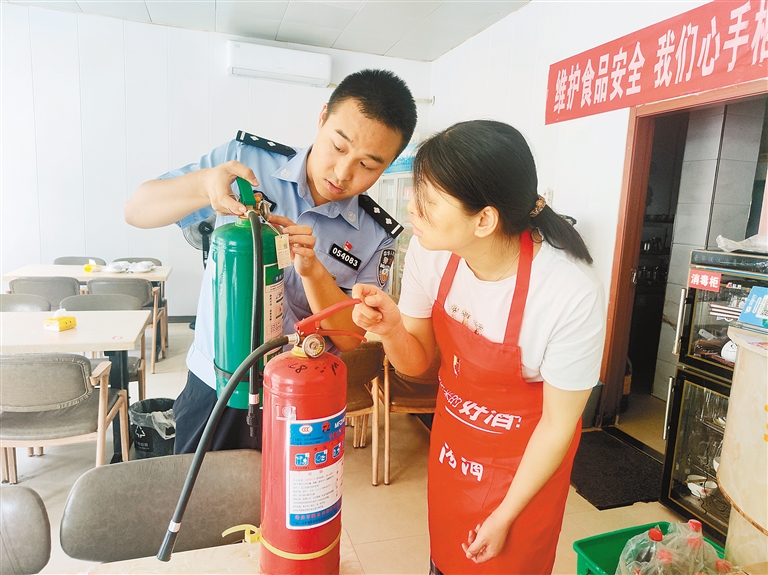 社区民警滑登远在南里王村一家饭店检查灭火器材配备情况