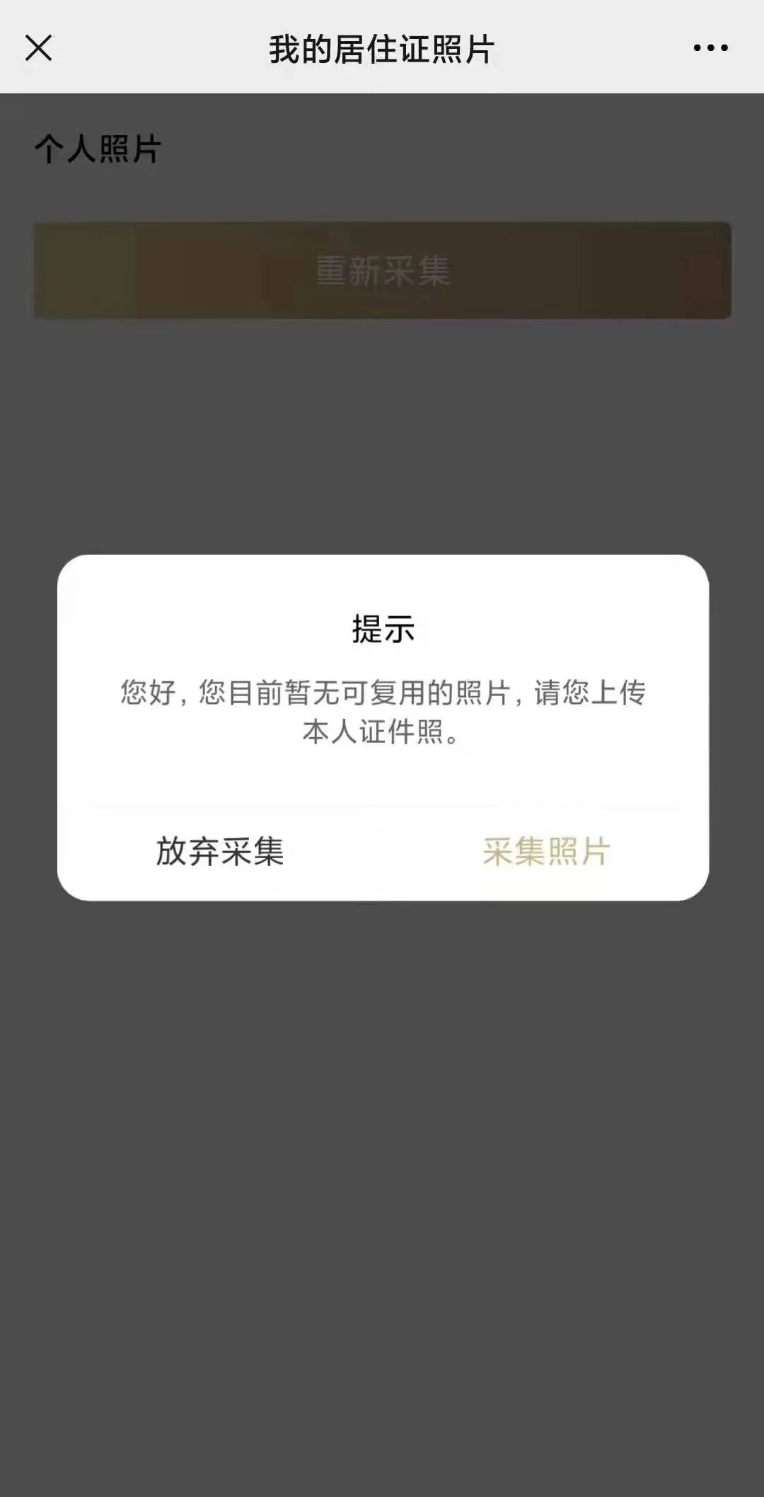 2、点击“办理居住证”按钮,会先核查用户是否有可用照片,无可用照片用户,弹框提示去采集照片;有可用照片用户前往居住证办理页。