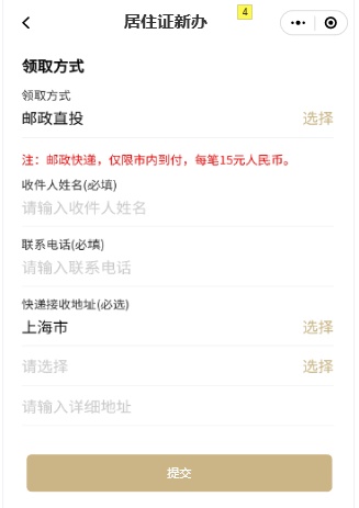 申请人在网上或受理网点申请居住证时,可以选择邮政专递服务。居住证制作完成后会通过邮政专递送证上门,货到付款(15元)。邮政专递服务仅限本市范围。
