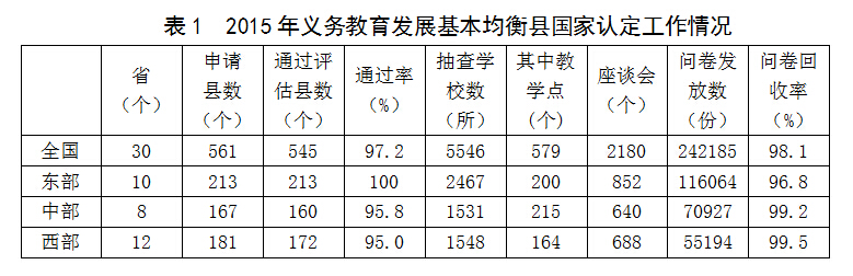 2015年,全国共有30个省(区、市)561个县级单位申报了义务教育发展基本均衡县(市、区)。国务院督导委员会办公室按照《县域义务教育均衡发展督导评估暂行办法》(以下简称《暂行办法》)标准要求,组织对申报材料进行审核,再对通过材料审核的545个县(市、区)进行实地督导检查,同时对天津、江苏和浙江三省43个往年通过认定的县进行复检。共安排国家督学和专家848人次,随机检查学校5546所(含教学点579个,特教学校7所),召开人大代表/政协委员、校长、教师、家长座谈会2180个,发放满意度调查问卷24.2万份,有效回收率达到98.1%,撰写并印发对受检省政府反馈意见30份,并在教育部网站公布(见表1)。最终,有545个县(市、区)通过国家督导评估认定,16个县(市、区)未通过。
