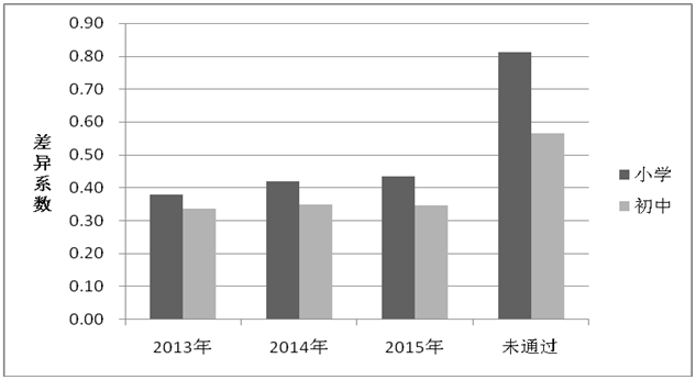 为了解掌握尚未实现基本均衡发展目标地区的现状,依据2014年全国教育事业统计数据,以《暂行办法》规定的核心内容――校际差距情况为主,对尚未通过国家评估认定的1600多个县均衡发展情况进行过程性监测。结果显示,整体上看,未认定县均衡水平明显低于国家标准、更低于已认定的1300多个县,实现均衡发展目标难度较大。进一步分析显示,中、西部地区分别有60%、72.5%的县尚未认定,将是攻坚难点地区;小学差异系数不达标比例较高,占未认定县总数比例的63%,将是攻坚难点学段。