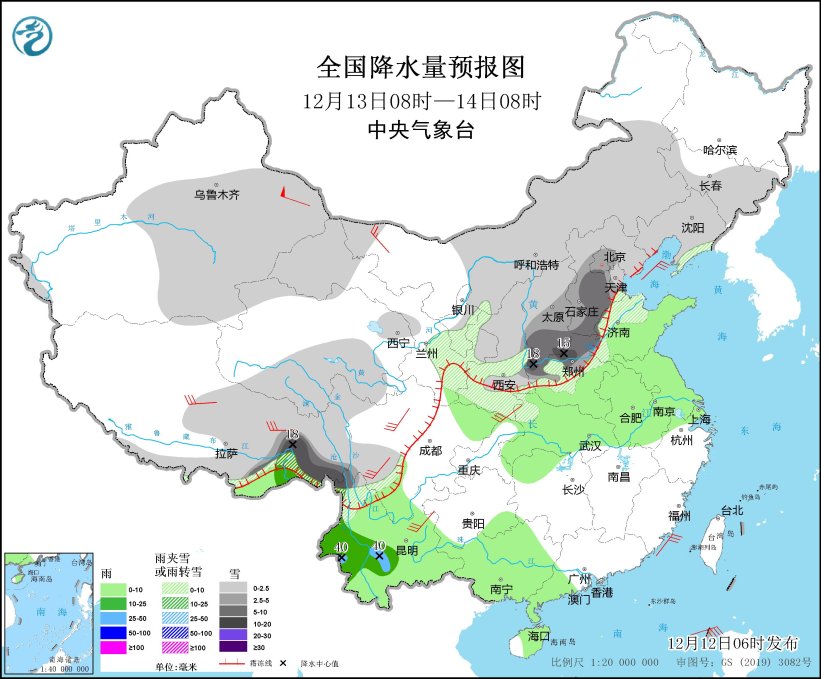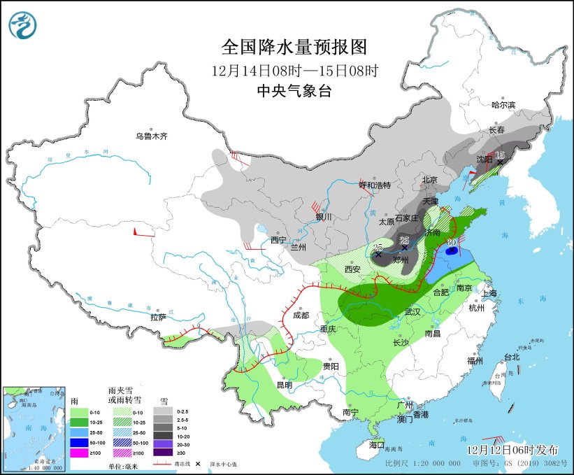 12月13日至15日,中东部地区将出现一次大范围雨雪天气过程,新疆北部、西北地区东部、内蒙古、华北、黄淮北部、东北地区中南部及青藏高原中东部有小到中雪,陕南、华北、黄淮北部、东北地区南部和东部等地的部分地区有大到暴雪,局地大暴雪,陕西中部、山西南部、河南中北部局地有冻雨;黄淮、江淮、江汉及湖南北部、重庆北部等地有中到大雨、局地暴雨。