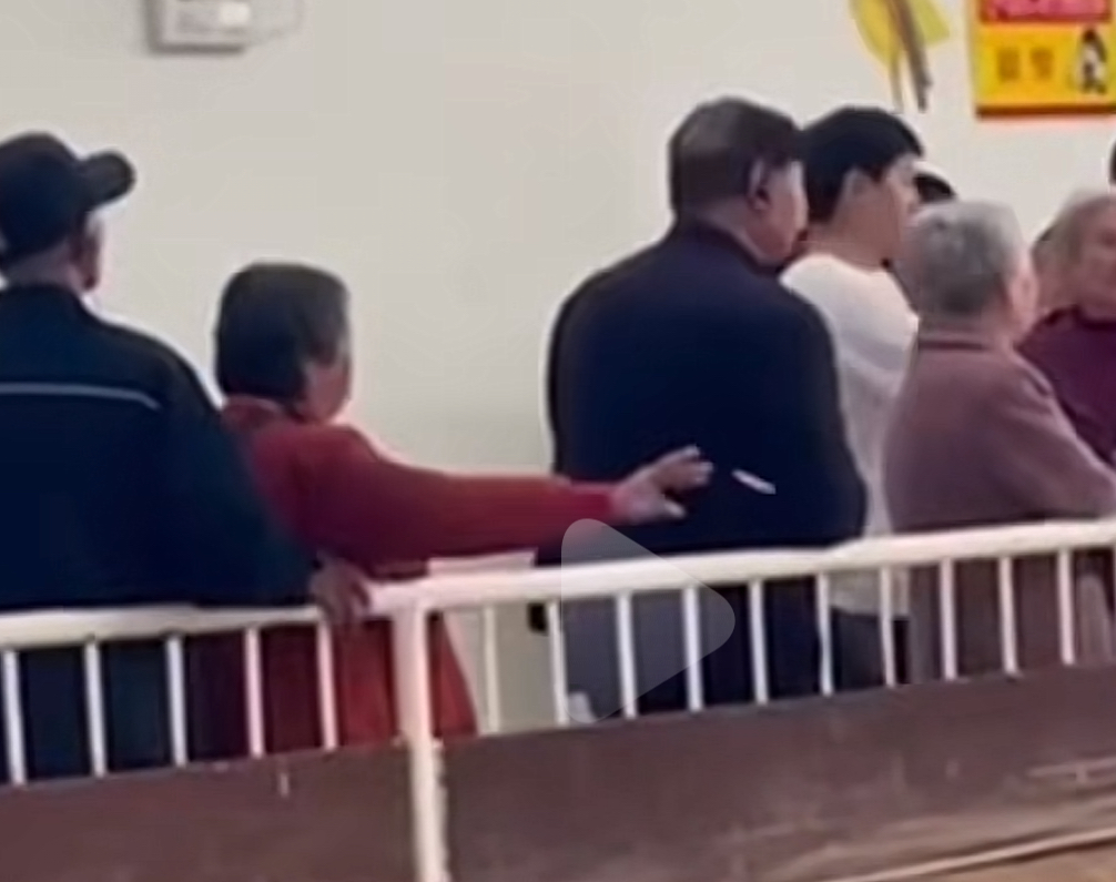 一老太在兵马俑坑内吐痰并扔烟头。(网传视频截图)