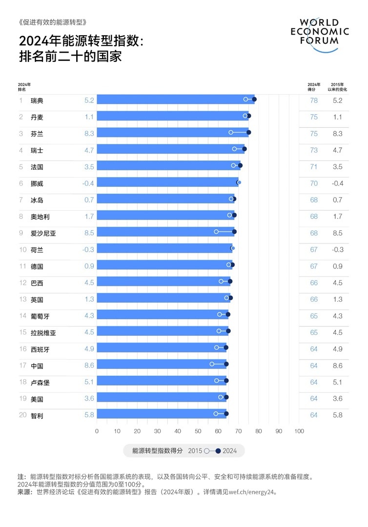 在2024年能源转型指数排行榜上排名前十的国家全部来自欧洲,前五名是瑞典、丹麦、芬兰、瑞士和法国。其中法国是首次进入前五名,在过去一年中,法国通过实施新的节能措施降低了能源强度。