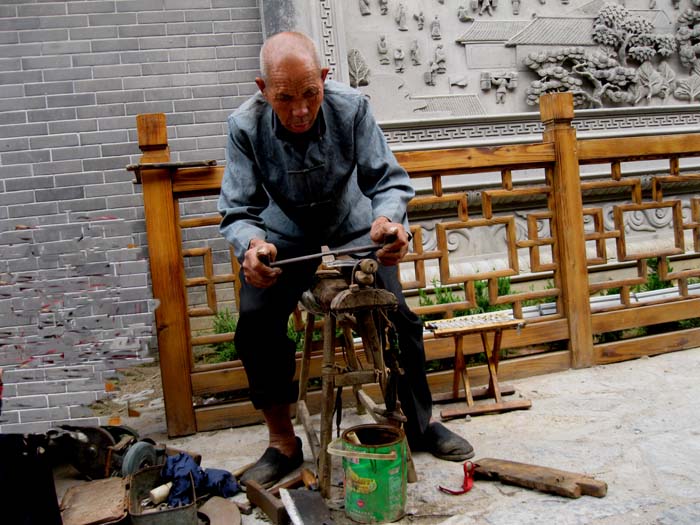 拉长声吆喝“磨剪子,戗菜刀”,走街串巷的磨刀匠一旦坐在四尺条凳上,刀锋划过磨刀石发出噌噌响声,那份自信、那份精细都推进手中的菜刀刃上。一把榔头在补锅匠手里扬起、落下,轻重缓急、紧打慢敲就能让锅碗瓢勺严丝合缝、完好如初,不漏、不裂、不扎手,好奇围观的孩子多想能看出个中奥妙。几口“仙”气就能吹出猪八戒、孙悟空、十二生肖的吹糖人老爷爷……这些我们眼中神奇无比、身怀绝技的老艺人越来越少见了。对于00后、10后的孩子们来说,老行当所承载的绝招、技艺只能在电视上、年节庙会上一睹真容,在家门口很难再见到了。
