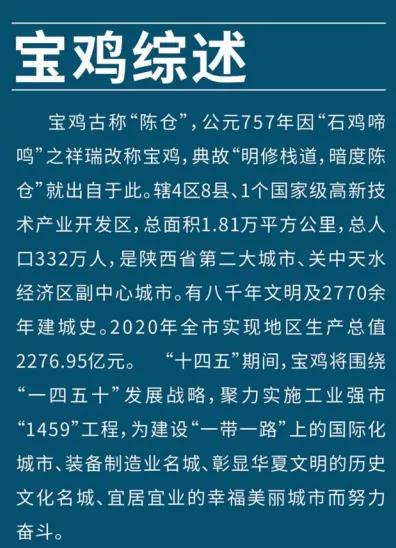 2、物其多矣,维其嘉矣。今天的宝鸡,是国家“一带一路”重要节点城市和关中平原城市群副中心城市,也是全国性综合交通枢纽和生产服务型物流枢纽承载城市,入选共和国70年70城人民记忆。