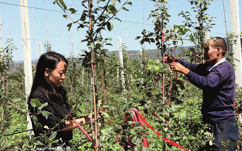 “爸爸的苹果”品牌创始人刘阿娟(左)与贫困户焦官账正在果园里修理枝条。刘红涛/摄
