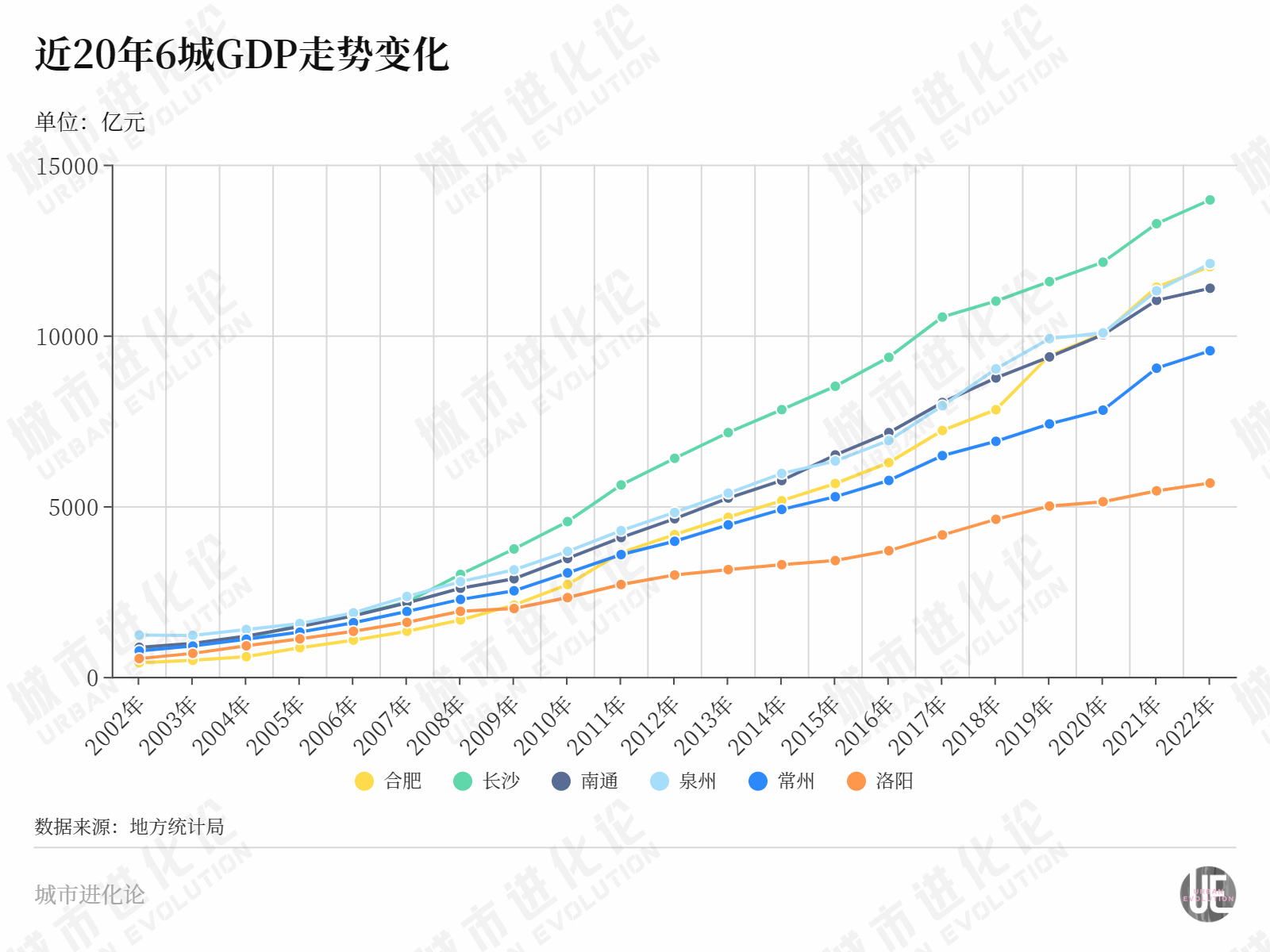 从经济走势看,这5座城市经济总量从5000亿级增至万亿左右,合肥、长沙用了6年,南通、泉州、常州用了7年。